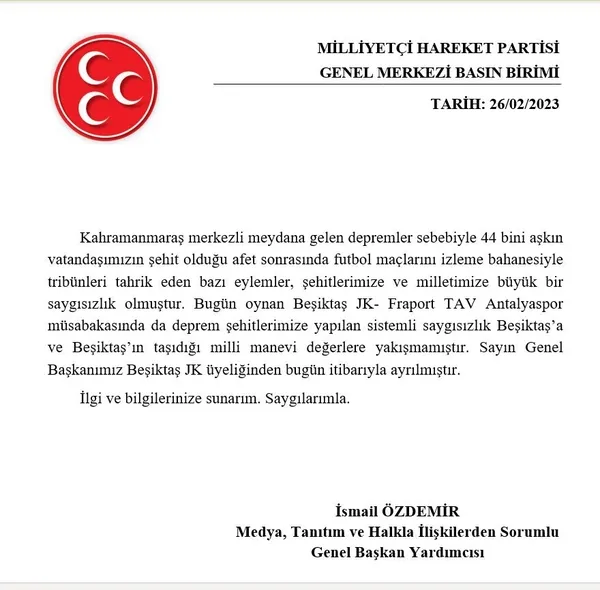 MHP'den yapılan açıklamada "Kahramanmaraş merkezli meydana gelen depremler sebebiyle 44 bini aşkın vatandaşımızın şehit olduğu afet sonrasında futbol maçlarını izleme bahanesiyle tribünleri tahrik eden bazı eylemler, şehitlerimize ve milletimize büyük bir saygısızlık olmuştur. Bugün oynanan Beşiktaş JK- Fraport TAV Antalyaspor müsabakasında da deprem şehitlerimize yapılan sistemli saygısızlık Beşiktaş'a ve Beşiktaş'ın taşıdığı milli manevi değerlere yakışmamıştır. Sayın Genel Başkanımız Devlet Bahçeli, Beşiktaş JK üyeliğinden bugün itibarıyla ayrılmıştır." denildi.