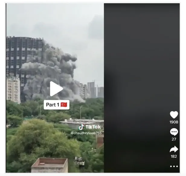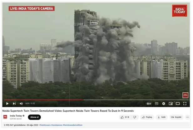 GERÇEK - Videonun 28 Ağustos 2022 tarihinde Hindistan'ın Noida şehrinde kaydedildiği tespit edildi. Binaların, imar yasalarını ihlal ettiği gerekçesiyle Yüksek Mahkeme tarafından 3 bin 700 kilogram patlayıcı kullanılarak yıkılma anında kaydedildiği belirlendi.