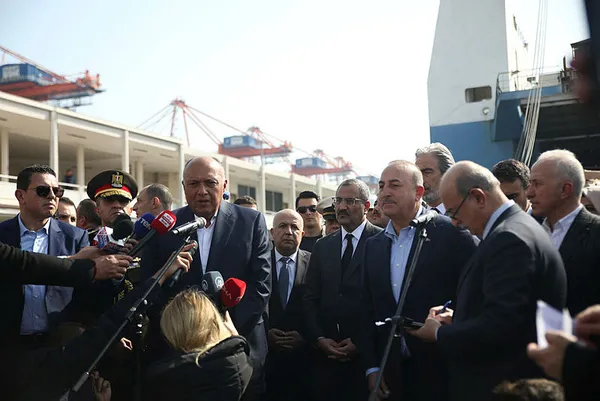 Çavuşoğlu ve Mısırlı mevkidaşı Samih Şukri, Mısır'dan yardım malzemesi taşıyan "El Hürriye" gemisinin yanaştığı Mersin Uluslararası Limanı'nda açıklama yaptı.