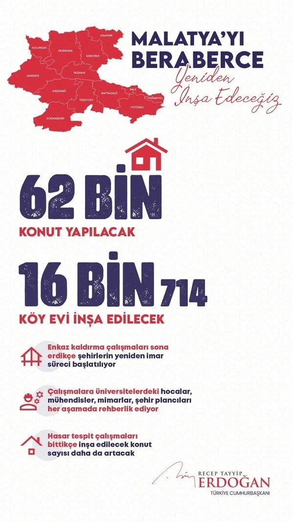 Malatya genelinde bu rakam 28 bin 915 binada 86 bin 332 bağımsız bölüme ulaşıyor. Bu tespitler ışığında inşa ve imar çalışmalarını hızlandırdık. Malatya'da 62 bin konut ve 16 bin 714 köy evi inşa edeceğiz. İnsanımızın canını tehlikeye atan tüm binaları yıkıp daha sağlam zeminlerde yenisini yaparak vatandaşlarımıza teslim etmekte kararlıyız. İnşallah en kısa zamanda Doğanşehir'i yeniden ayağa kaldıracağız. Geçmişte bunu defalarca başardık. Elazığ, Malatya, İzmir, Düzce, Van depremlerinde, Antalya ve Muğla yangınlarında, Kastamonu, Sinop, Bartın ve Giresun sel afetlerinde, bölücü terör örgütünün saldırıları sonucu enkaza dönen il ve ilçelerimizde bunu yaptık. 'Yapamazsınız, başaramazsınız' diyenlere rağmen vatandaşlarımıza verdiğimiz sözleri her seferinde yerine getirdik. Siz bize inandınız, itimat ettiniz, güvendiniz. Hamdolsun biz de şimdiye kadar size asla mahcup olmadık."