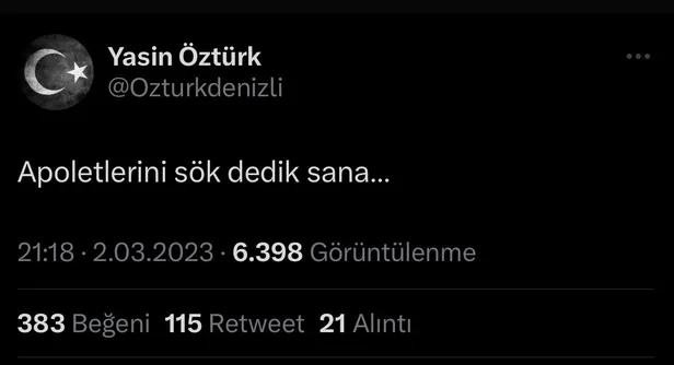 İYİ Parti Denizli Milletvekili Yasin Öztürk, "Apoletlerini sök dedik sana…" paylaşımında bulundu.