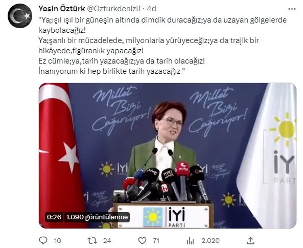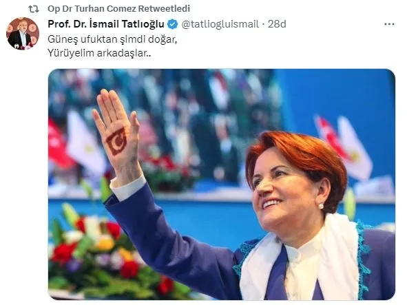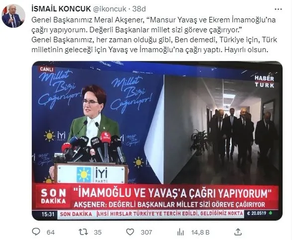 İsmail Koncuk: Genel Başkanımız Meral Akşener, "Mansur Yavaş ve Ekrem İmamoğlu'na çağrı yapıyorum. Değerli Başkanlar millet sizi göreve çağırıyor." Genel Başkanımız, her zaman olduğu gibi, Ben demedi, Türkiye için, Türk milletinin geleceği için Yavaş ve İmamoğlu'na çağrı yaptı. Hayırlı olsun.