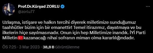 İYİ Parti Sözcüsü Kürşad Zorlu, "İYİ Parti, milletin kazanacağı nihai sofranın mimarı olma kararlılığındadır" dedi. İYİ Parti Sözcüsü Zorlu, CHP Genel Başkanı Kemal Kılıçdaroğlu'nun açıklamalarına Twitter'dan cevap verdi. Zorlu, "'Uzlaşma, istişare ve halkın tercihi' diyerek milletimize sunduğumuz taahhütler bizim için bir emanettir. Temel itirazımız, dayatmaya ve bu ilkelerin hiçe sayılmasınadır. Onun için hep milletimize inandık. İYİ Parti, milletin kazanacağı nihai sofranın mimarı olma kararlılığındadır" ifadelerini kullandı.