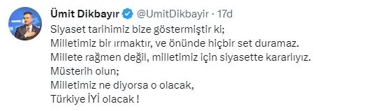 Ümit Dikbayır: Siyaset tarihimiz bize göstermiştir ki; Milletimiz bir ırmaktır, ve önünde hiçbir set duramaz. Millete rağmen değil, milletimiz için siyasette kararlıyız. Müsterih olun; Milletimiz ne diyorsa o olacak, Türkiye İYİ olacak !