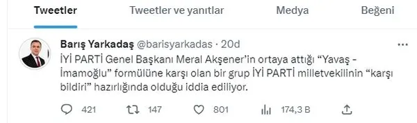 Yarkadaş, "İYİ PARTİ Genel Başkanı Meral Akşener'in ortaya attığı "Yavaş - İmamoğlu" formülüne karşı olan bir grup İYİ PARTİ milletvekilinin "karşı bildiri" hazırlığında olduğu iddia ediliyor." ifadelerini kullandı.