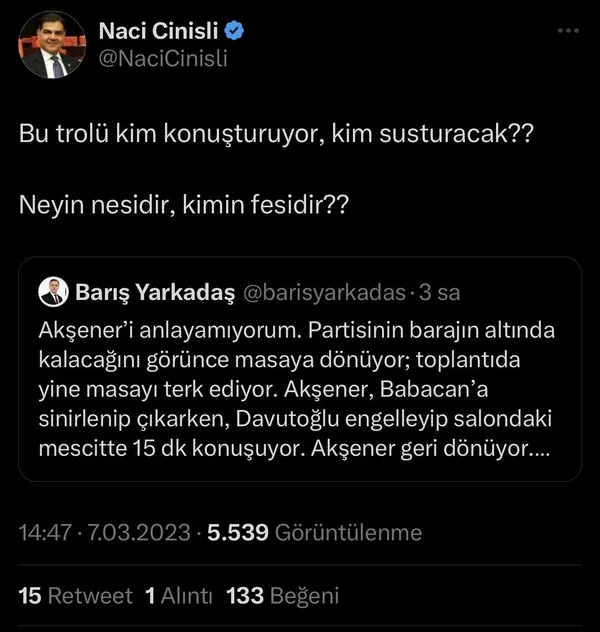 Hem Barış Yarkadaş hem Cumhuriyet Meral Akşener'i hedef aldı İYİ Partili Naci Cinisli büyük tepki gösterdi: Bu trolü kim konuşturuyor?