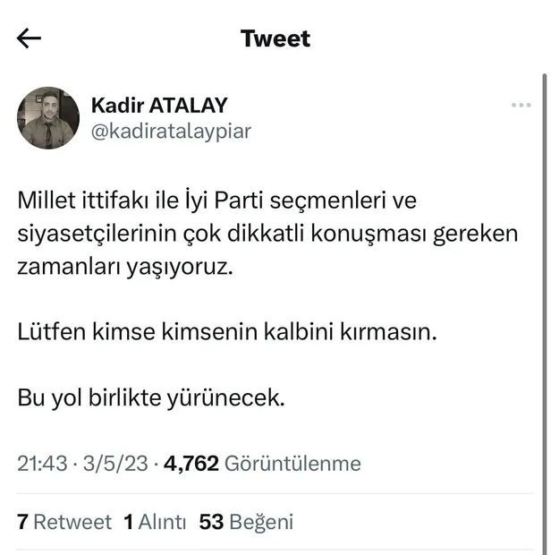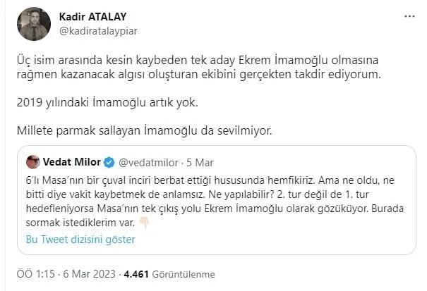 Piar şirketi sahibi Kadir Atalay da "itibarsız" ve "manipilatör" anketçilerinden biri olarak liste başında yer alıyor. Sosyal medya hesaplarında "trol" üslubuyla ve Kılıçdaroğlu için "ateşli yandaşlığı", CHP'den mi fonlanıyor sorusunu akla getiriyor. Özellikle İBB Başkanı Ekrem İmamoğlu aleyhindeki paylaşımları da bu soruyu daha anlamlı yapıyor. İşte o paylaşımları: