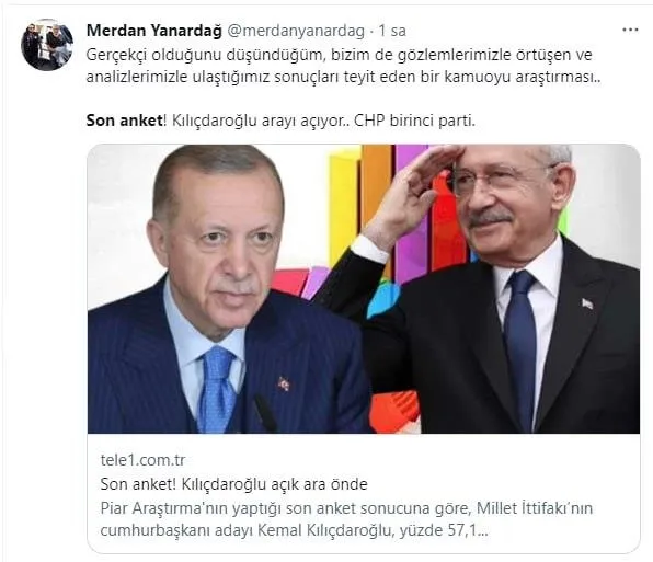 CHP medyası uyduruk anketle geçmiş seçimlerdeki gibi algı oyununa da başladı. Tele 1 yayın yönetmeni ve Kılıçdaroğlu'nun "ateşli yandaşı" Merdan Yanardağ da anket üfürmesini, "Gerçekçi olduğunu düşündüğüm, bizim de gözlemlerimizle örtüşen ve analizlerimizle ulaştığımız sonuçları teyit eden bir kamuoyu araştırması.. Son anket! Kılıçdaroğlu arayı açıyor.. CHP birinci parti." paylaşımıyla manşetine taşıdı.