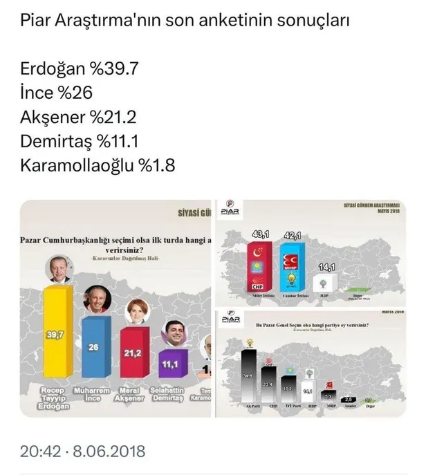 2018 seçimlerindeki performansı ile tam bir "manipülasyoncu anketçi" olduğu tescillenen Piar Araştırma şirketi, 14 Mayıs'ta yapılacak seçimlerde altılı koalisyonun adayı Kemal Kılıçdaroğlu'nun yüzde 57.1, Cumhur İttifakı Adayı Başkan Recep Tayyip Erdoğan'ın yüzde 42.9 oy alacağını öne sürdü. Oysa aynı şirket 2018 seçimlerinde de Erdoğan'ın yüzde 39.7 oy alacağını iddia etmiş, Cumhur İttifakı seçimi yüzde 52.6 ile kazanmıştı.