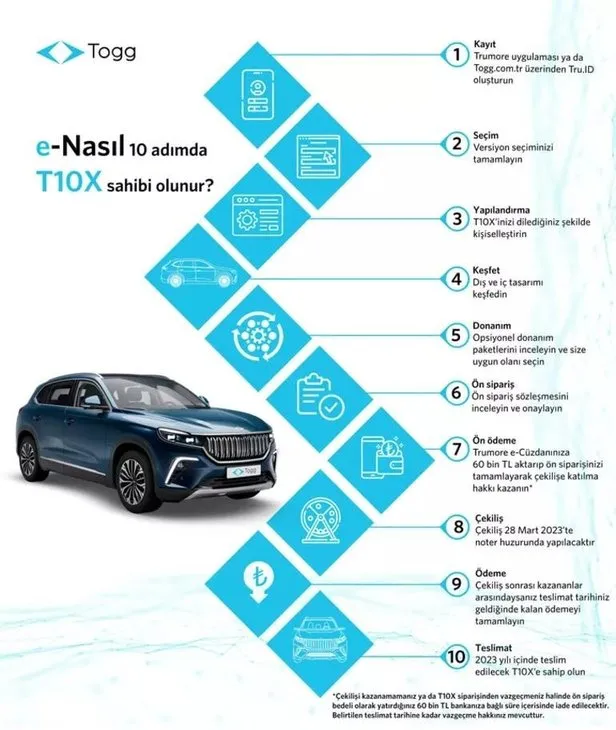 Togg'dan yapılan açıklamaya göre, 2023 yılı boyunca kullanıcılarla buluşacak 12 bin T10X için ön sipariş sahiplerini belirleyecek çekiliş süreci, 27 Mart'a kadar devam edecek.