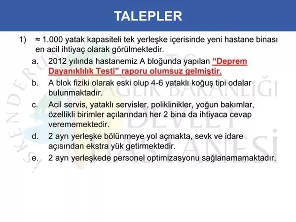A Blok'a 2012 yılında verilen 'depreme dayanıksız' raporu da tutanaklara girdi. Hatta bu rapor, İskenderun Devlet Hastanesi'nin anlatıldığı ve halen hastanenin internet adresinde yer alan 46 sayfalık sunumun son sayfasında da "1000 yatak kapasiteli tek yerleşke içerisinde yeni hastane binası en acil ihtiyaç olarak görülmektedir. 2012 yılında hastanemiz A Blok'unda yapılan 'Deprem Dayanıklılık Testi' raporu olumsuz gelmiştir. A Blok fiziki olarak eski olup 4-6 yataklı koğuş tipi odalar bulunmaktadır" ifadesiyle yer alıyor.