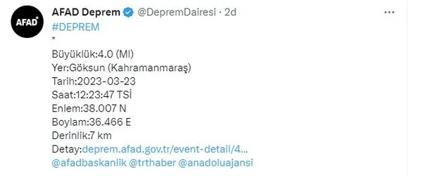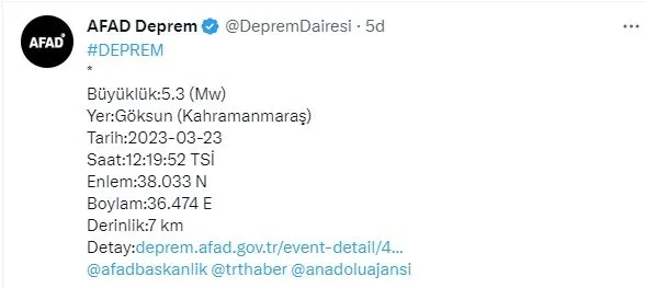 Afet ve Acil Durum Yönetimi Başkanlığı (AFAD) Kahramanmaraş'ta bugün (23 Mart 2023) saat 12.19'da bir deprem meydana geldiğini duyurdu. Depremin Göksun merkezli ve 5,3 büyüklüğünde olduğunu bildirildi.
