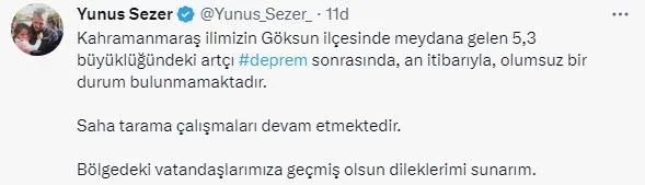 AFAD Başkanı Yunus Sezer, "Kahramanmaraş ilimizin Göksun ilçesinde meydana gelen 5,3 büyüklüğündeki artçı #deprem sonrasında, an itibarıyla, olumsuz bir durum bulunmamaktadır. Saha tarama çalışmaları devam etmektedir. Bölgedeki vatandaşlarımıza geçmiş olsun dileklerimi sunarım." ifadelerini kullandı.