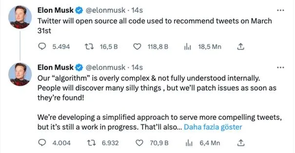 Gelen eleştiriler üzerine Elon Musk, tweet öneri algoritmasının 31 Mart'ta açık kaynak olarak sunulacağını açıkladı.