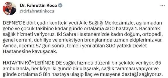 Bakan Koca, Twitter hesabından yaptığı açıklamada, "Defne'de 4 çadır kentteki 7 aile sağlığı merkezimiz ile aşılamadan gebe ve çocuk takibine kadar günde ortalama 400 hastaya 1'inci basamak sağlık hizmeti veriyoruz. 2 sahra hastanemizde kadın doğum, ortopedi, genel cerrahi, dahiliye ve enfeksiyon branşlarında uzman ekiplerimiz var. Ayrıca ilçemiz 57 gün sonra temeli yeni atılan 300 yataklı devlet hastanesine kavuşacak. Hatay'ın köylerinde de sağlık hizmeti düzenli bir şekilde veriliyor. 65 ambulans ile her köye 2 günde 1 ulaşarak, sağlık taraması yapıyor ve günde ortalama 5 bin hastaya ulaşıp ilaç ve muayene desteği sağlıyoruz" ifadelerini kullandı.