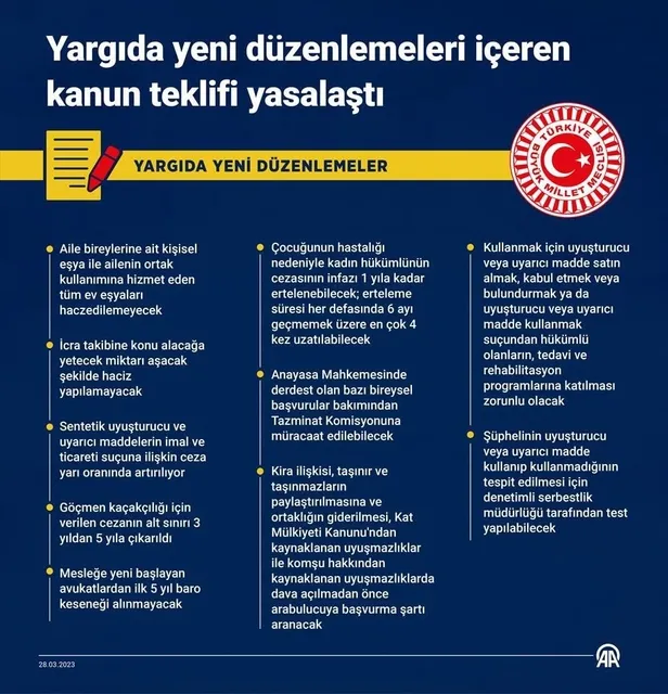 Göçmen kaçakçılığı suçuyla daha etkin mücadele edilmesi ve caydırıcılığın sağlanması amacıyla Türk Ceza Kanunu'nda değişikliğe gidilerek, göçmen kaçakçılığı suçu için verilen cezanın alt sınırı 3 yıldan 5 yıla çıkarıldı. Sentetik uyuşturucu ve uyarıcı maddelerin topluma ve bireylere verdiği zararların önüne geçilmesi, bu maddelerin imal ve ticareti suçuyla daha etkin mücadele edilmesi amacıyla sentetik katinon ve türevleri, sentetik opioid ve türevleri ile amfetamin ve türevlerinin imal ve ticareti suçuna ilişkin ceza, yarı oranında artırılacak.