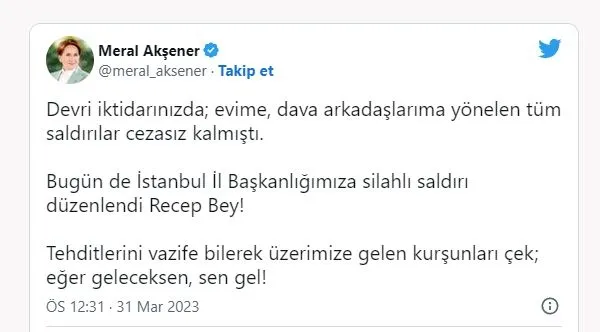 Akşener, sosyal medya hesabından yaptığı paylaşımda skandal bir şekilde Başkan Erdoğan'ı hedef göstererek, "Devri iktidarınızda; evime, dava arkadaşlarıma yönelen tüm saldırılar cezasız kalmıştı. Bugün de İstanbul İl Başkanlığımıza silahlı saldırı düzenlendi Recep Bey! Tehditlerini vazife bilerek üzerimize gelen kurşunları çek; eğer geleceksen, sen gel!" ifadelerini kullanmıştı.