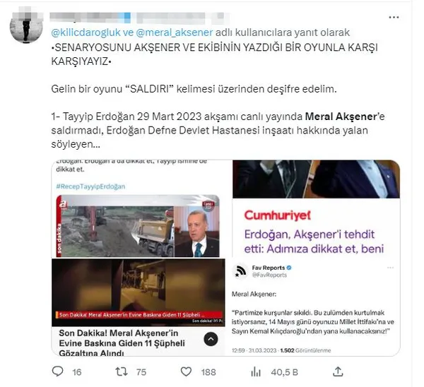 1- Tayyip Erdoğan 29 Mart 2023 akşamı canlı yayında Meral Akşener'e saldırmadı, Erdoğan Defne Devlet Hastanesi inşaatı hakkında yalan söyleyen Meral Akşener'e cevap verdi.