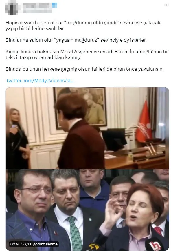 Hapis cezası haberi alırlar "mağdur mu oldu şimdi" sevinciyle çak çak yapıp bir birlerine sarılırlar. Binalarına saldırı olur "yaşasın mağduruz" sevinciyle oy isterler. Kimse kusura bakmasın Meral Akşener ve evladı Ekrem İmamoğlu'nun bir tek zil takıp oynamadıkları kalmış. Binada bulunan herkese geçmiş olsun failleri de biran önce yakalansın.
