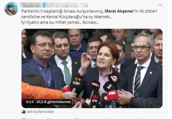 Partisinin il başkanlığı binası kurşunlanmış, Meral Akşener'in ilk sözleri kendisine ve Kemal Kılıçdaroğlu'na oy istemek.. İyi tiyatro ama bu millet yemez.. Acınası..