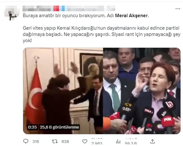 Buraya amatör bir oyuncu bırakıyorum. Adı Meral Akşener. Geri vites yapıp Kemal Kılıçdaroğlu'nun dayatmalarını kabul edince partisi dağılmaya başladı. Ne yapacağını şaşırdı. Siyasi rant için yapmayacağı şey yok!