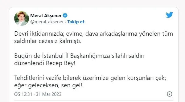 Akşener, sosyal medya hesabından yaptığı paylaşımda, "Devri iktidarınızda; evime, dava arkadaşlarıma yönelen tüm saldırılar cezasız kalmıştı. Bugün de İstanbul İl Başkanlığımıza silahlı saldırı düzenlendi Recep Bey! Tehditlerini vazife bilerek üzerimize gelen kurşunları çek; eğer geleceksen, sen gel!" ifadelerini kullanmıştı.