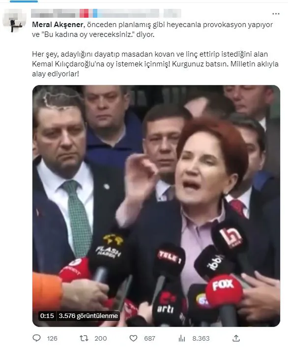 2- Ancak Erdoğan'ın konuşmasından çok kısa süre sonra Akşener'in adamları ve fondaş medya "Erdoğan Akşener'e SALDIRDI" demeye başladılar. 3- Ardından 5 Ekim 2018'de Akşener'i protesto eden bir grup ile Akşener arasında geçen video yeniymiş gibi ve SALDIRI ifadesi ile servis edildi.