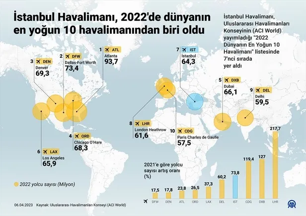 İstanbul Havalimanı işletmecisi İGA'nın sosyal medya hesaplarından yapılan paylaşımda, "Uluslararası Havalimanları Konseyinin yayımladığı Dünyanın En Yoğun 10 Havalimanı listesinde, 2022 yılında 64 milyondan fazla yolcu ağırlayarak 7. sırada yer aldık. Bizi tercih eden tüm yolcularımıza teşekkür ederiz." ifadeleri kullanıldı.