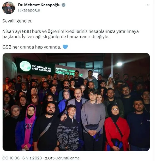 Son dakika haberleri... Gençlik ve Spor Bakanı Mehmet Kasapoğlu, Nisan ayı GSB burs ve öğrenim kredisi ödemelerinin başladığını duyurdu.