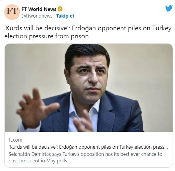 Edirne'deki cezavinden İngiliz gazetesi Financial Times'ın sorularını yanıtlayan eski HDP Eş Genel Başkanı Selahattin Demirtaş, altılı masanın cumhurbaşkanı adayı ve CHP Genel Başkanı Kemal Kılıçdaroğlu'nun "değişim ve demokrasi için içten bir çaba sarf ettiğini" ifade etti.