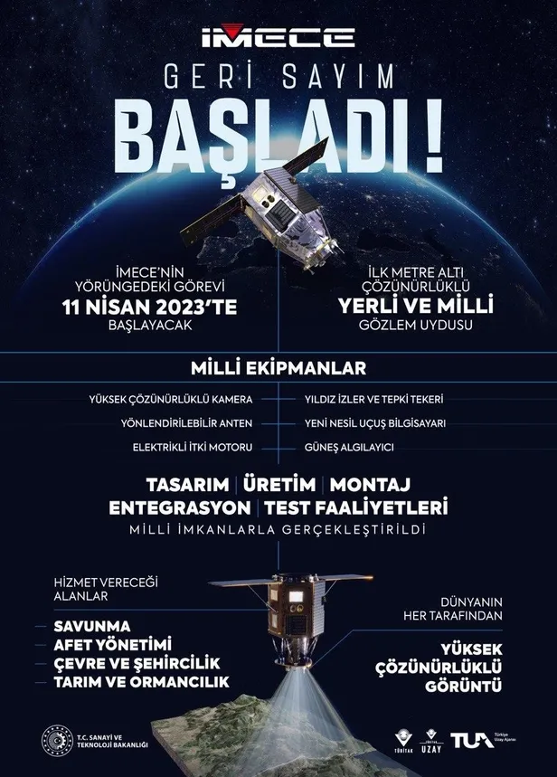 Cumhurbaşkanlığı Strateji ve Bütçe Başkanlığı ve TÜBİTAK 1007 programı ile desteklenen, Milli Savunma Bakanlığı ve Cumhurbaşkanlığı Savunma Sanayi Başkanlığı koordinasyonu ile yürütülen proje kapsamında geliştirilen İMECE Uydusu, yörüngedeki testleri tamamlandıktan sonra Hava Kuvvetleri Komutanlığı envanterine dahil olacak.
