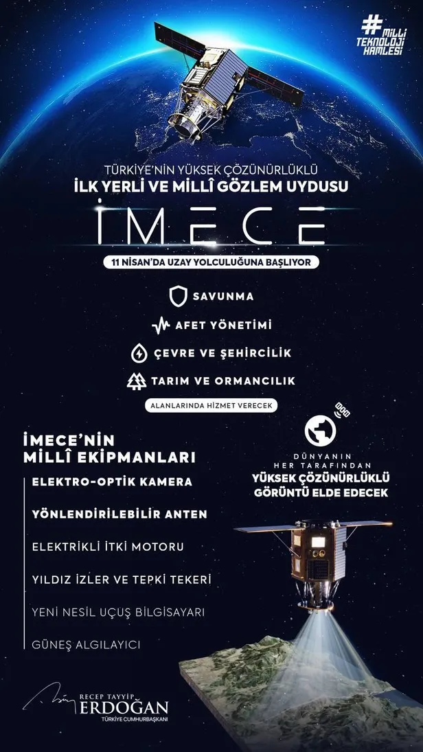 Başkan Erdoğan, sosyal medya hesabından yaptığı paylaşımda, "Yerli ve milli imkanlarla ürettiğimiz yüksek çözünürlüğe sahip ilk gözlem uydumuz İMECE, 11 Nisan'da uzaydaki yörüngesine fırlatılacak. Yetişmiş insan kaynağımız, sağladığımız imkanlar ve geliştirdiğimiz teknolojiler sayesinde küresel uzay yarışında var olmayı sürdüreceğiz." ifadesini kullandı.