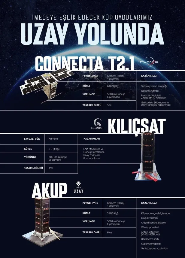 Bu arada, İMECE ile birlikte yine TÜBİTAK UZAY tarafından geliştirilen görüntüleme uydusu AKUP, ASELSAN ve GÜMÜŞ firması işbirliği ile üretilen görüntüleme uydusu KILIÇSAT, PLAN-S firması tarafından üretilen nesnelerin interneti ve görüntüleme uydusu CONNECTA T2.1 küp uyduları da aynı roket içerisinde uzaya fırlatılacak.