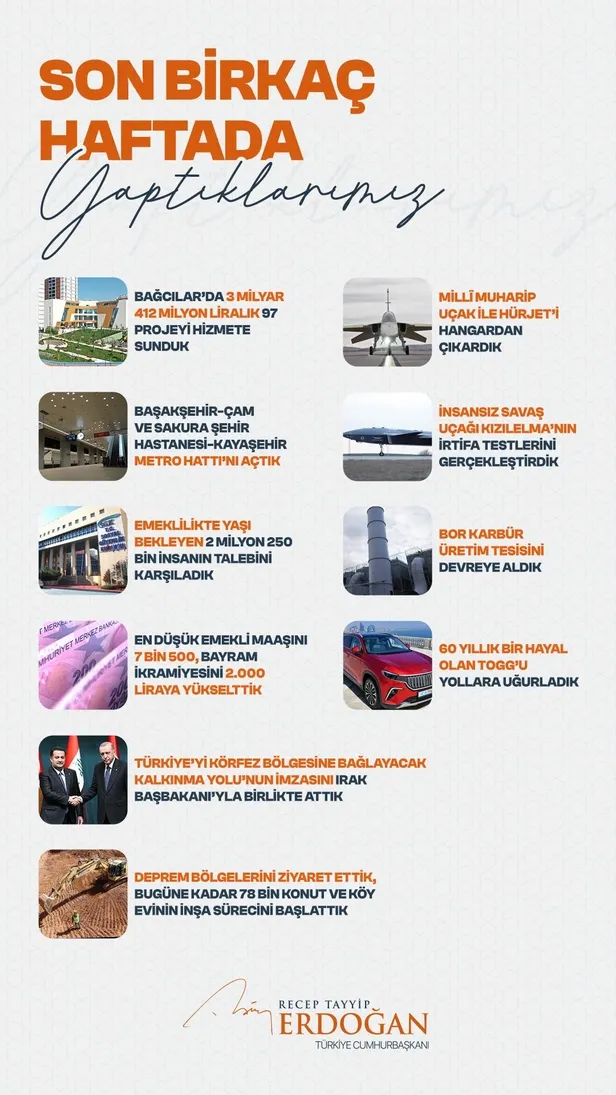 "Bağcılar'da 3 milyar 412 milyon liralık 97 projeyi hizmete sunduk. Milli Muharip Uçak ile Hürjet'i hangardan çıkardık. Başakşehir Çam ve Sakura Şehir Hastanesi Kayaşehir Metro Hattı'nı açtık. İnsansız savaş uçağı Kızılelma'nın irtifa testlerini gerçekleştirdik. Emeklilikte yaşı bekleyen 2 milyon 250 bin insanın talebini karşıladık. Bor Karbür Üretim Tesisi'ni devreye aldık. En düşük emekli maaşını 7 bin 500, bayram ikramiyesini 2 bin liraya yükselttik. 60 yıllık bir hayal olan Togg'u yollara uğurladık. Türkiye'yi Körfez bölgesine bağlayacak Kalkınma Yolu'nun imzasını Irak Başbakanı ile birlikte attık. Deprem bölgelerini ziyaret ettik, bugüne kadar 78 bin konut ve köy evinin inşa sürecini başlattık."