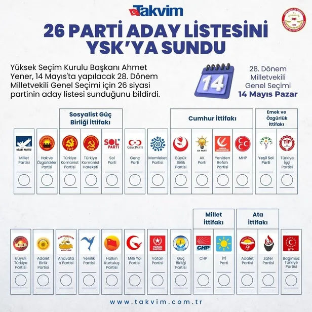 15 Nisan'da geçici aday listeleri ilan edilecek ve itiraz süreci başlayacak. YSK itirazları değerlendirecek ve 19 Nisan'da kesin listelerini açıklayacak.