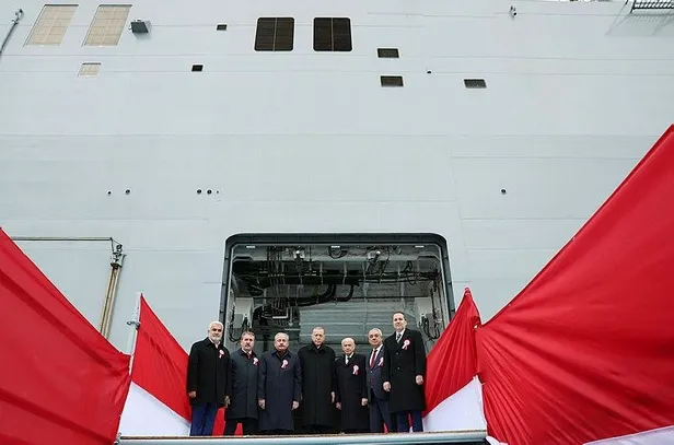Tören sonrası TCG Anadolu önünde Cumhur İttifakı'nı oluşturan siyasi partilerin liderleriyle hatıra fotoğrafı çektiren Erdoğan, ardından gemide incelemelerde bulundu.