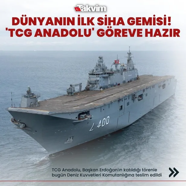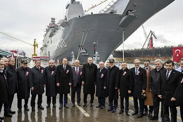 Dünyanın ilk silahlı insansız hava aracı (SİHA) gemisi TCG Anadolu, Başkan Erdoğan'ın katıldığı törenle Deniz Kuvvetleri Komutanlığına teslim edildi. Başkan Erdoğan törenin ardından 3 yeni MİLGEM fırkateyninin sac kesimini yaptı. Başkan Erdoğan, törende önemli açıklamalarda bulundu. TCG Anadolu'nun dünyanın her köşesinde askeri operasyon yapabilecek özelliklere sahip olduğunu belirten Erdoğan, "TCG Anadolu dünyada örneği olmayan bir proje." dedi. Savunma sanayi bütçesinin 75 milyar dolara yükseltidiğini belirten Erdoğan, "TCG Anadolu'yu Sirkeci'yi çekip halkımıza açacağız." ifadelerini kullandı. Erdoğan, Türkiye'nin kendi gemisini tasarlayan 10 ülkeden biri olduğunu bildirdi.