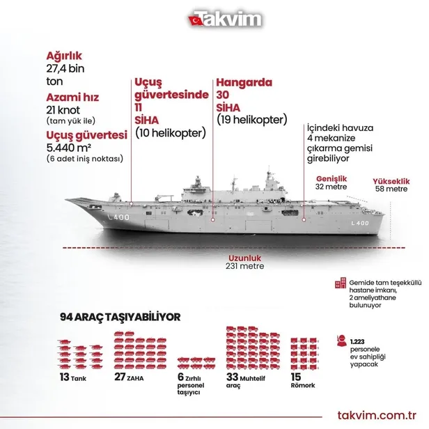 Geminin uçuş güvertesinde 10 helikopter veya 11 adet SİHA konuşlandırılabilecek, hangarda ise 19 helikopter veya 30 SİHA taşınabilecek. Gemi, 1.223 personele ev sahipliği yapacak. Gemide, tam teşekküllü hastane imkanı ve 2 ameliyathane de bulunuyor.