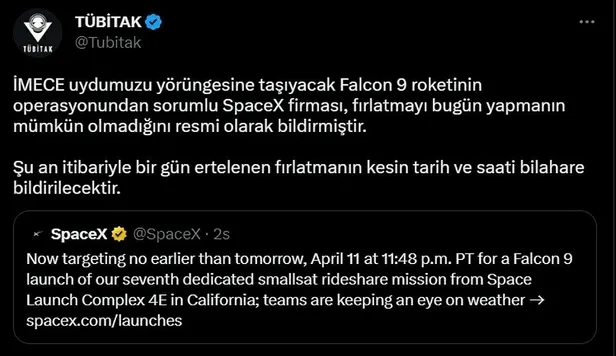 TÜBİTAK'ın Twitter hesabından yapılan açıklamada, İMECE uydusunu yörüngesine taşıyacak Falcon 9 roketinin operasyonundan sorumlu SpaceX firmasının, fırlatmayı bugün yapmanın mümkün olmadığını resmi olarak bildirdiği aktarıldı.