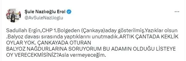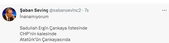 CHP yandaşı Şaban Sevinç, "İnanamıyorum. Sadullah Ergin Çankaya listesinde. CHP'nin kalesinde. Atatürk'ün Çankaya'sında." paylaşımını yaptı.