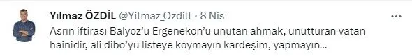 Gazeteci Yılmaz Ödil ise Ergin için, "Asrın iftirası Balyoz'u Ergenekon'u unutan ahmak, unutturan vatan hainidir, Ali Dibo'yu listeye koymayın kardeşim, yapmayın…" dedi.