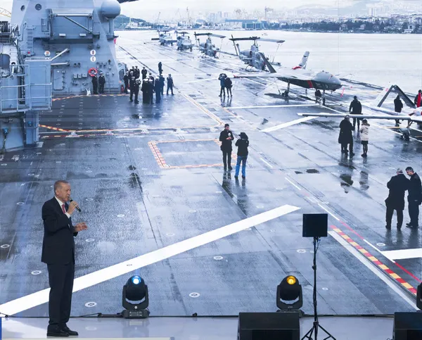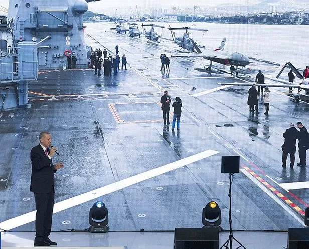 Geçmişte milletine "yapamazsın" denilen ne varsa hepsinin de olabileceğini gösterdiklerini belirten Erdoğan, savunma sanayisinden ulaşım ve enerji altyapısına, yerli otomobile, uçağa kadar her alanda bunun sayısız örneklerinin bulunduğunu aktardı. Erdoğan, üzerinde konuşlanacak Kızılelma'sı ve Bayraktar TB-3'üyle, kendi sınıfındaki dünyanın ilk insansız hava araçlarıyla donatılmış savaş gemisinin dün hizmete alındığını hatırlattı.