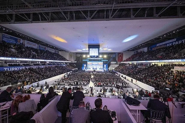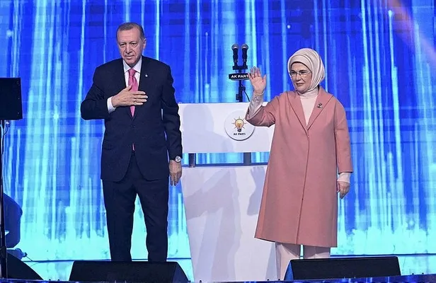 Başkan Erdoğan, salona birlikte girdiği eşi Emine Erdoğan ile kürsüye el ele çıktı ve partilileri selamladı.