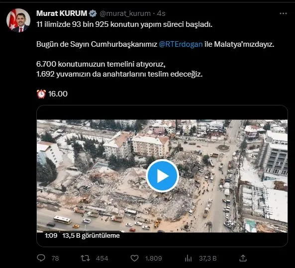Çevre, Şehircilik ve İklim Değişikliği Bakanı Murat Kurum, resmi sosyal medya hesabından yaptığı paylaşımında, "11 ilimizde 93 bin 925 konutun yapım süreci başladı. Bugün de Sayın Cumhurbaşkanımız Recep Tayyip Erdoğan ile Malatya'mızdayız. 6.700 konutumuzun temelini atıyoruz, 1.692 yuvamızın da anahtarlarını teslim edeceğiz" ifadelerini kullanarak Malatya'nın inşası ile ilgili görüntülerin yer aldığı bir video paylaşımında bulundu.