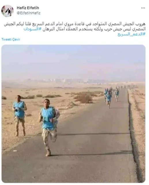 Twitter'da popüler olan görüntülerden biri ise, Mısır askerlerinin RSF güçleri önünde kaçışını gösteren sahte fotoğraflardı.