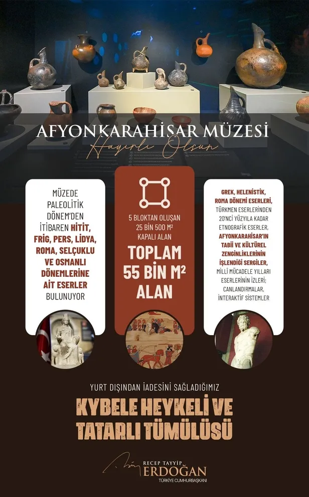 Afyonkarahisar Müzesi'nin açılışını Başkan Recep Tayyip Erdoğan yaptı. Müzede, paleolitik dönemden itibaren Hitit, Frig, Pers, Lidya, Roma, Selçuklu ve Osmanlı dönemlerine ait eserler bulunuyor. Müzede ayrıca yurt dışından iadesi sağlanan Kybele Heykeli ve Tatarlı Tümülüsü de yer alacak.