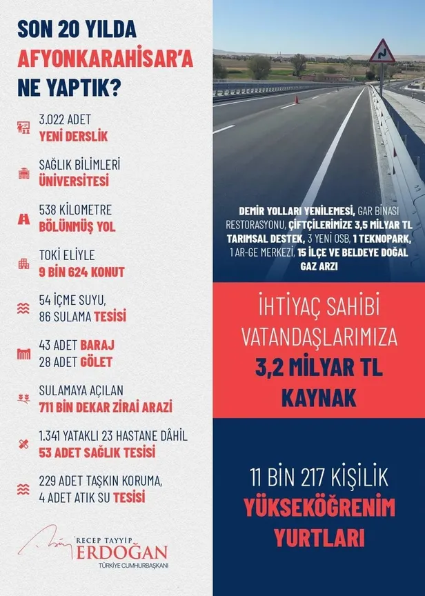 Ulaştırmada 2002 yılına kadar Afyonkarahisar'a ne kadar yol yapıldı biliyor musunuz? 54 kilometre. Biz bunu 592 kilometreye çıkardık. Çay, Bolvadin, Emirdağ ve Akşehir-Afyon yolunu inşallah bu yıl bitiriyoruz. Afyonkarahisar sınırları içerisindeki demir yollarını yeniledik. Gar binasını restore ettik. Ankara-Afyonkarahisar-İzmir yüksek hızlı tren hattının yapımı devam ediyor Bu hattın 2025 yılında tamamlanmasıyla Afyonkarahisar'dan Ankara'ya 1,5 saatte İstanbul'a 3,5 saatte ve İzmir'e 2 saatte gidilebilecek. Tarım ve ormanda Afyonkarahisar'a 43 baraj, 28 gölet, 54 içme suyu tesisi, 86 sulama tesisi, 2 arazi toplulaştırma projesi, 229 taşkın koruma tesisi, 3 yeraltı depolama ve 4 atık su arıtma tesisi inşa ettik. Afyonkarahisar'da 711 bin dekar zirai araziyi sulamaya açarak yıllık 2 milyar lira zirai gelir artışı sağladık. Afyonlu çiftçilerimize toplam 3,5 milyar lira tutarında tarımsal destek verdik."