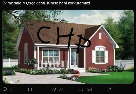 Biri ev fotoğrafının üstüne CHP yazan bir vatandaş ise provokasyonun boyutunu gözler önüne seren paylaşımda, "Evime saldırı gerçekleşti. Kimse beni korkutamaz!" diyerek Kaftancıoğlu'nun siyasi rant tiyatrosunu deşifre etti.