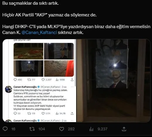14 Mayıs seçimlerine günler kala yaşanan adli vakalar üzerinden siyasi rant elde etmeye çalışan 7'li koalisyonun üyeleri hiçbir fırsatı kaçırmıyor. CHP'li Canan Kaftancıoğlu sosyal medyadan paylaştığı fotoğraflarla mahalle temsilciliklerinde yapılan provokasyonla ilgili tehditler savurdu. Kaftancıoğlu'nun provokasyonuna çok geçmeden elinde patladı. Sosyal medyadan tepki gösteren vatandaşlar, "Bu saçmalıklar da sıktı artık. Hiçbir AK Partili “AKP” yazmaz da söylemez de. Hangi DHKP-C’li yada MLKP’liye yazdırdıysan biraz daha eğitim vermelisin Canan Kaftancıoğlu sıktınız artık." ifadeleriyle ucuz tiyatroyu ortaya çıkardı. İstanbul Valiliği, olaya karışan 6 şüphelinin yakalanmasına ilişkin çalışmaların sürdüğünü bildirdi. Kaftancıoğlu, benzer bir şekilde İstanbul İl Başkanlığı etrafında duyulan silah seslerini saldırı olarak tanımlamış ancak olayın faillerinin havaya ateş açan magandalar olduğu ortaya çıkmıştı. Magandalarının kullandığı araçta PKK müziklerinin çalması belirlenmişti.