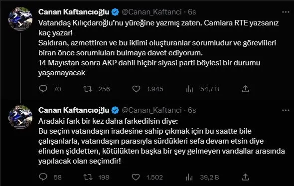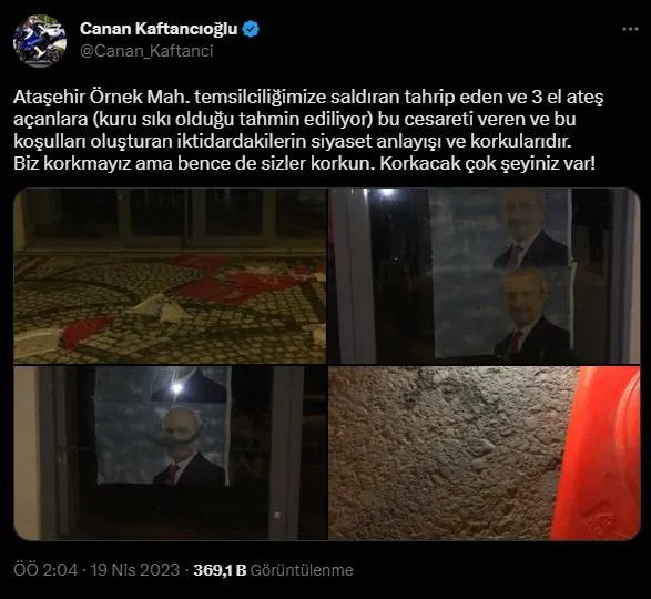 "Biz korkmayız ama bence de sizler korkun. Korkacak çok şeyiniz var!" diyerek provokasyon üzerinden siyasi rant üretmeye çalışan Kaftancıoğlu, "Ataşehir Örnek Mah. temsilciliğimize saldıran tahrip eden ve 3 el ateş açanlara (kuru sıkı olduğu tahmin ediliyor) bu cesareti veren ve bu koşulları oluşturan iktidardakilerin siyaset anlayışı ve korkularıdır." ifadelerini kullandı.